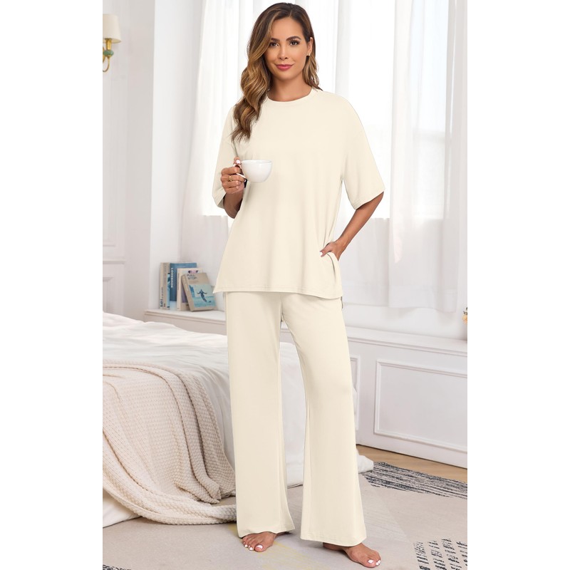 Lounge Set for Women/Loungewear for Women/Women Loungewear Sets/Short Sleeve Pajamas Tops for Women/Wide Leg Pjs Pants for Women/Pajamas Sets for Women/Two Piece Pjs Set/Matching Sets for Women/Summer Clothes for Women/Slit Hem Pullover/Long Pants with Pockets/2 Piece Outfits for Women/Airport Outfits for Women 2025