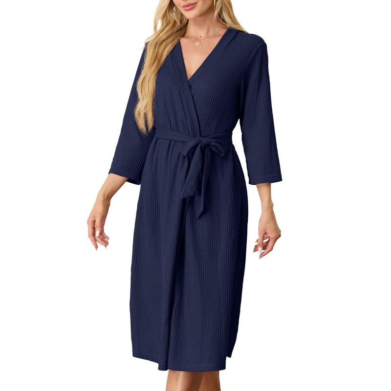 PrinStory Women's Lightweight Waffle Dressing Gown 3/4 Sleeves V-Neck Kimono Robes Long Sleepwear, navy