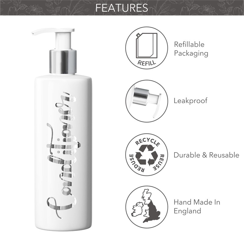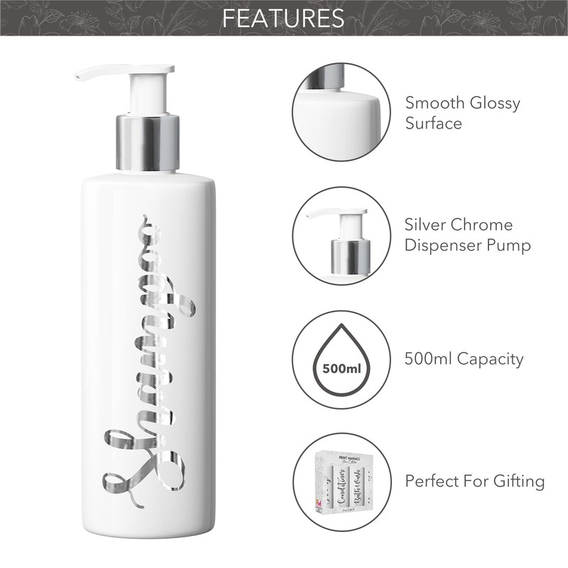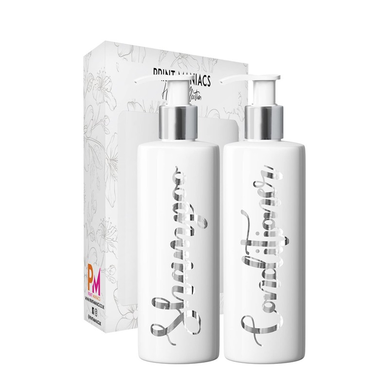Print Maniacs 2 Set Mrs Hinch Inspired White Personalised Dispenser Pump Bottles Shampoo Conditioner (Silver)