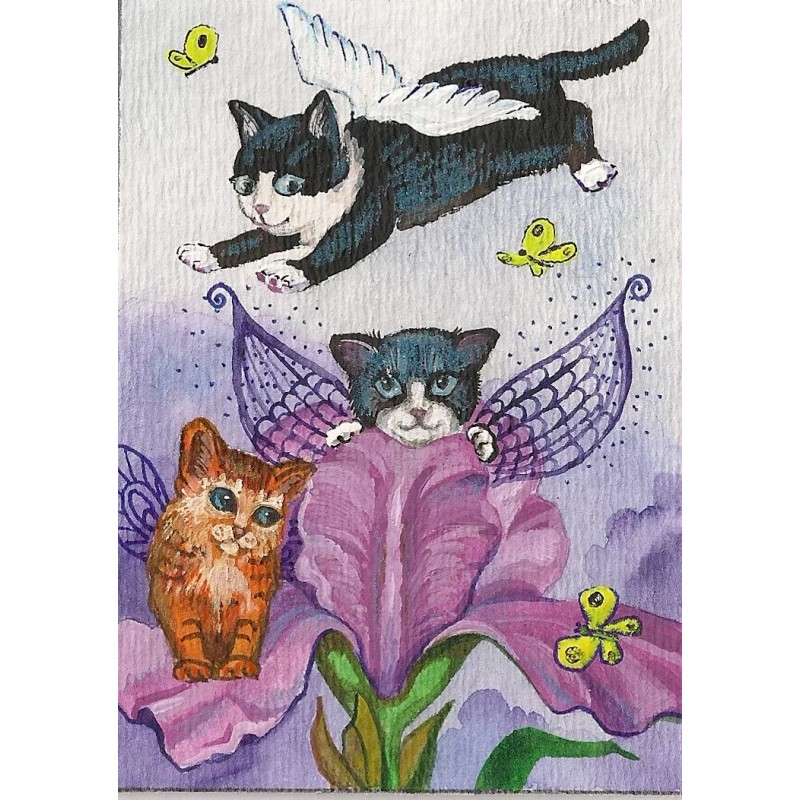 PRINT OF ACEO PAINTING RYTA TUXEDO BLACK CAT FAIRY GARDEN SPRING FOLK Art Iris