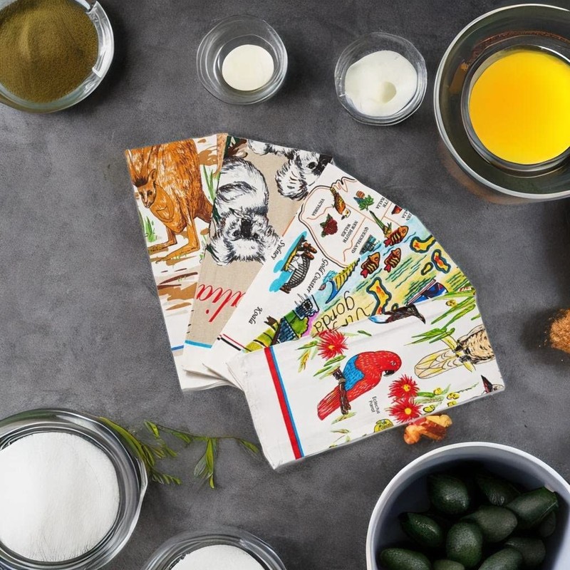 - Do you like Australia? It is absolutely worth buying a set tea towel, not just one! One set of printed tea towels will take you on a tour of Australia. The print dishtowel set includes 5 pcs tea towels, which will showcase the beautiful scenery, diverse wildlife, and colorful plants of Australia in all directions. By buying this set of tea towels, you can bring a piece of Australia back home with you.