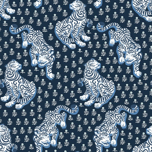 • Navy blue peel and stick NuWallpaper designed by Printfresh featuring posing tigresses and small florals.