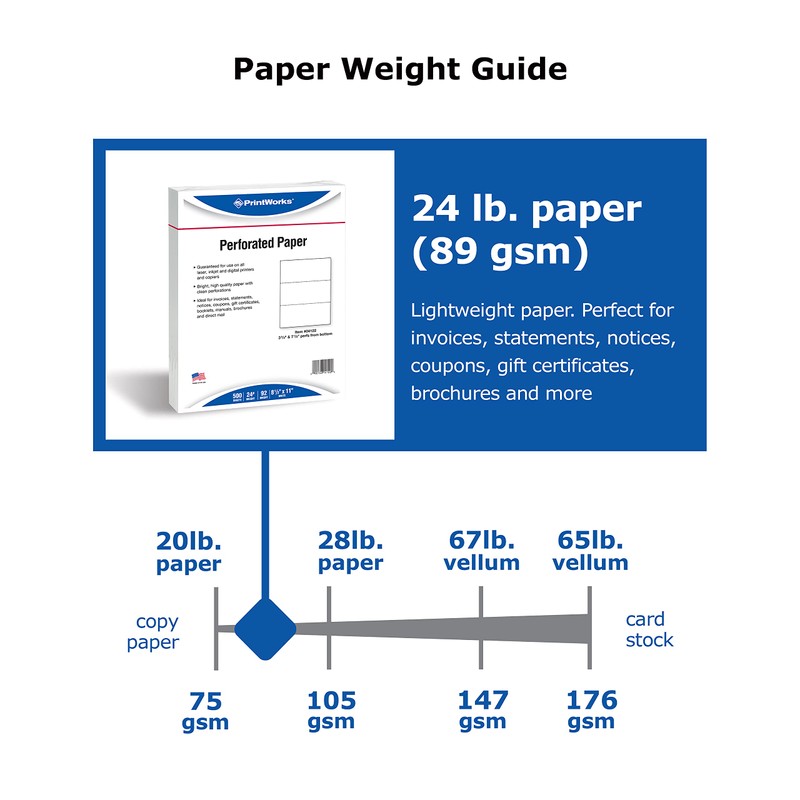 PrintWorks Professional perf papers are available in 8.5 x 11, 8.5 x 14 and 11 x 17 formats - both 20 lb. and 24 lb - so you can tailor your paper to your need and printing/copier equipment.