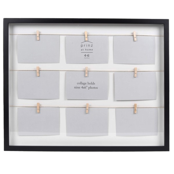 Prinz 9 Opening Clothespin Collage Picture Frame for 4x6 Photos, Wall Hanging, Black