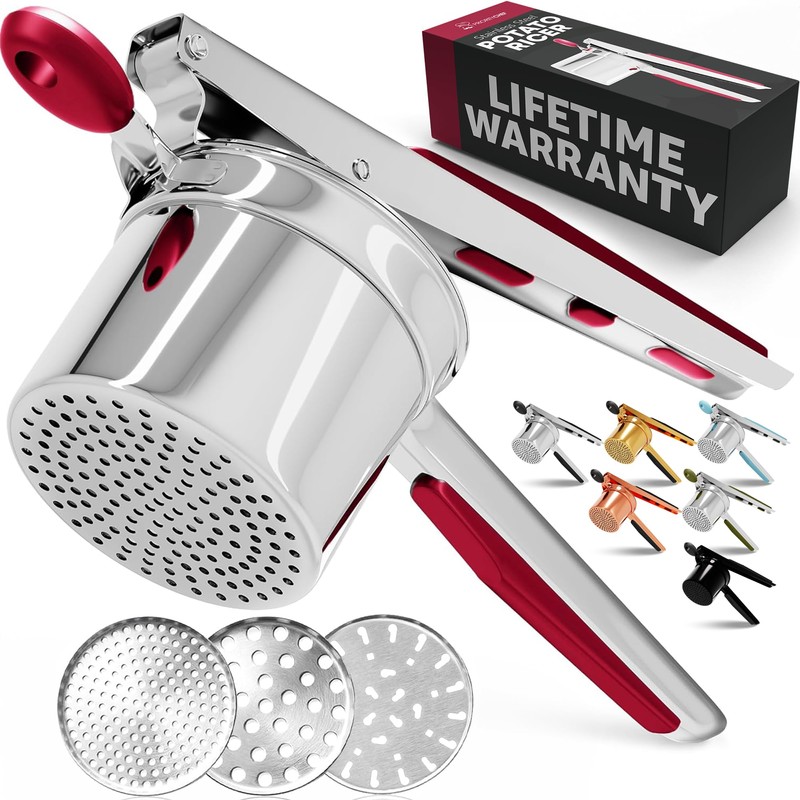 PriorityChef Large 15oz Potato Ricer With 3 Discs, Heavy Duty Stainless Steel Potato Ricer for Mashed Potatoes, Potato Masher, Press and Ricer Kitchen Tool, Red