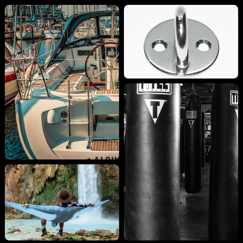 - Features: areas of application: ships, boats, terraces, balcony, home, garden, garage, basement, etc. Areas of application: bridle holder, holder for hay net, tie-hook, hanging hook, punch bag holder, boat attachment, lamp holder, tarpaulin attachment, safety net holder, safety hooks, sun sail fixings, wall mounting, washing line, carabiner, connecting ring, hanger etc. | Product type: eye plate, top plate, eyelet plate, eye plate, round plate, Plate, fixing hooks.