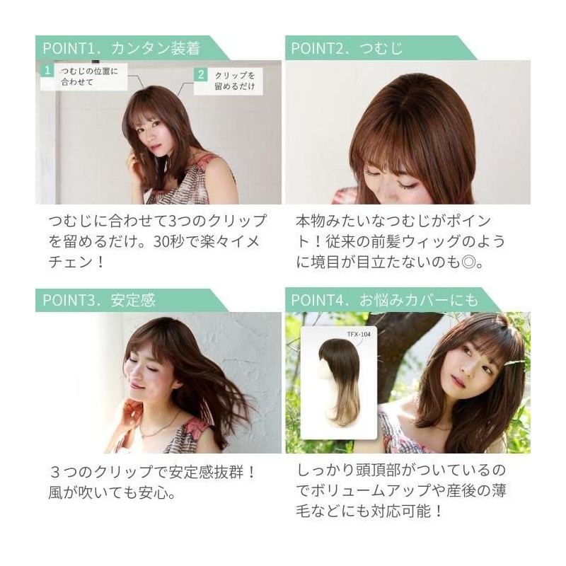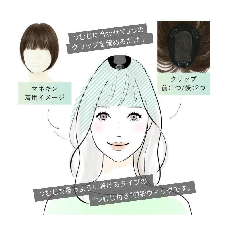- ■ Wig Type: Machine Made Bangs Wig (with whorle) A part wig that can be worn on both sides of your own hair