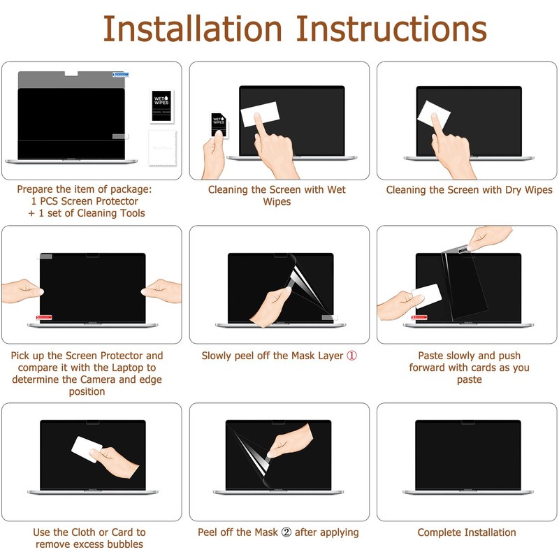 - Package contents: 1 PCS Privacy Screen Protector + 1 set of Cleaning Tools + Installation instructions. Please read the installation instructions on the back of the package before installation. Other are for illustration and are not included