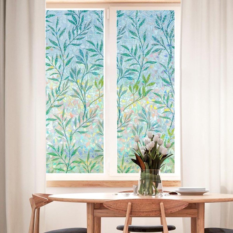 Privacy Window Film, No Adhesive Reusable, Colored Glass Effect Static Cling Glass Door Film, UV & Heat Insulation Window Covering, 3D Rainbow Leaf Design, 17" x 78.7" for Home & Office