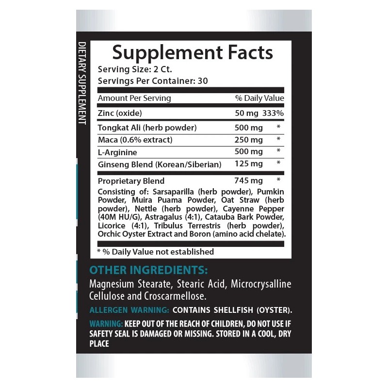 - Active Ingredients: Maca, Muira Puama (Ptychopetalum olacoides), Saw Palmetto, Maca Root Extract
