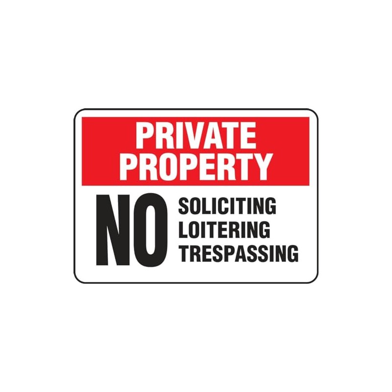 • Price For: Each Mounting Style: Surface Legend: Private Property No Soliciting Loitering Trespassing Width: 14" Material: Adhesive Vinyl Item: Private Property Sign Height: 10" Legend Style: OSHA Language: English Standards: OSHA Legend/Background Color: Black and White/Red and White Country of Origin (subject to change): United States