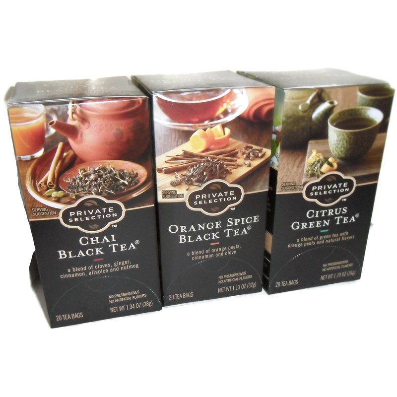 Private Selection Citrus Green Tea, Chai Black Tea, and Orange Spice Black Tea