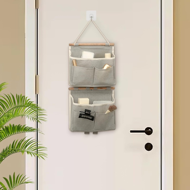 - Combined set: you will receive 2 beige wall storage bags (23 x 25 x 6 cm) and 2 self-adhesive hooks. The wall bag comes with wooden sticks and hanging cords and can be hung on the door or wall to keep your room tidy.