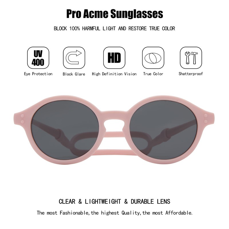 Pro Acme Cute Round Polarized Baby Sunglasses with TPEE Strap, Flexible Rubber Shades for Toddler Newborn Infant Ages 0-36 Months (Pink Frame | Grey Lens)
