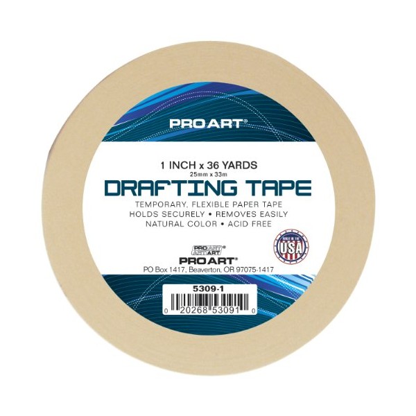 Pro Art drafting tape designed for temporary adhesive needs, such as holding drawings, blueprints or tracings to drawing boards. This thin, conformable and flexible paper tape holds securely, yet removes easily and cleanly, without residue. Acid Free. Natural color. Available in several different sizes.