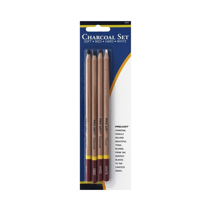 Pro Art charcoal pencil set. Three degrees of charcoal pencils (hard, medium and soft) with a white sketch pencil. The charcoal pencils are easier to handle and control than stick charcoal with a slightly harder texture that produces firm lines and strokes.