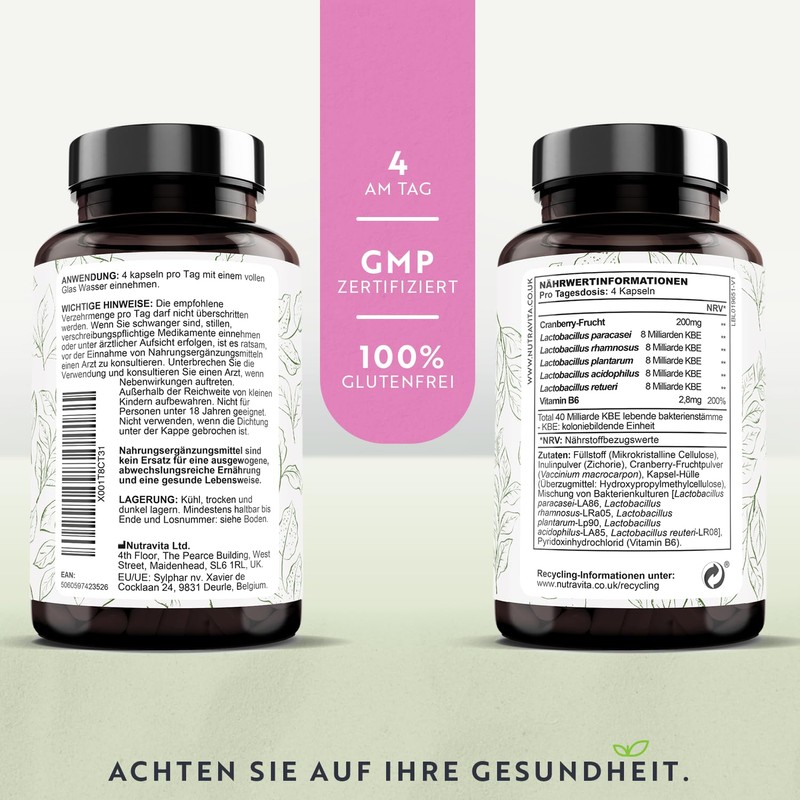 - ✔ VEGAN PROBIOTIC CAPSULES FOR WOMEN – Our easy-to-swallow probiotic capsules are filled with high-quality viable bacteria with 40 billion CFU and a 5-strain complex, so you can be sure that you are taking expertly formulated probiotics for women's intimate health from a trusted brand. Our probiotics are vegan and contain cranberry and vitamin B6 to support female intimate flora and vaginal health.