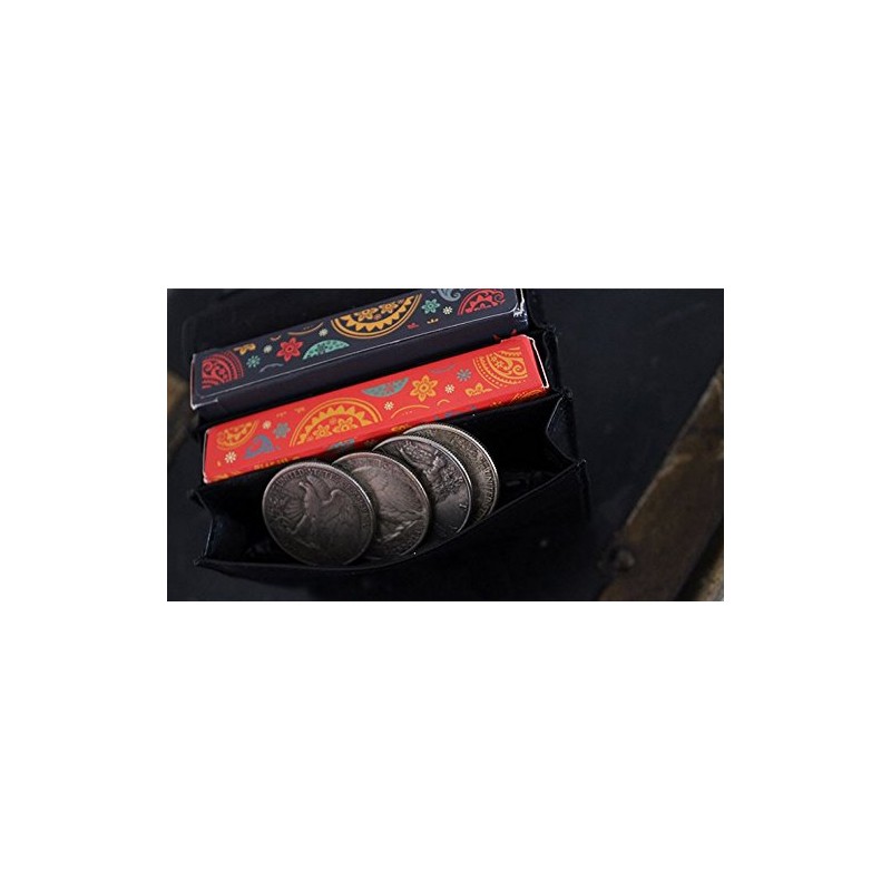Holds two decks, four half dollars, 4 pack tricks and business cards.