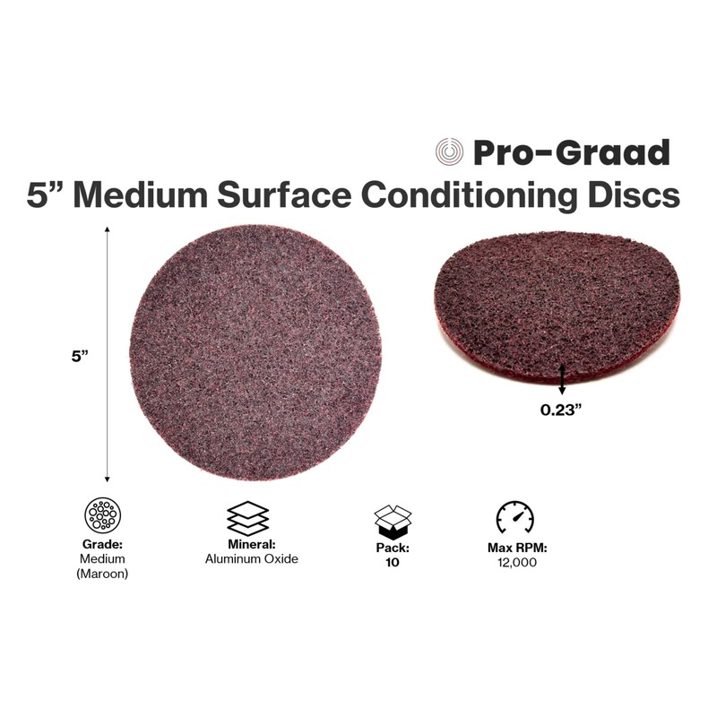 - [IN THE BOX]: 10 pack Pro-Graad 5" AMED Hook & Loop Surface Conditioning Discs, Maroon, Medium Grit - Aluminum Oxide