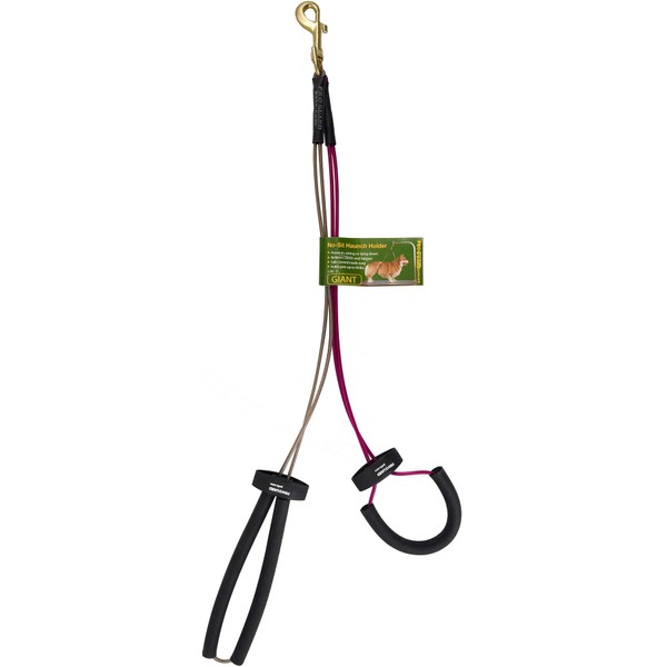 This professional quality haunch holder restraint for large dogs measures 22" and 25" in length. It is a great tool to have on hand for the "sitters" as it helps to keep pets from sitting or lying down. The Haunch Holder is a humane way to better control the movement of a dog that needs to be groomed. It keeps dogs standing in comfort with no additional tools. Our No-Sit Haunch Holder is the safe, comfortable and easy way to prevent pets from sitting down while working on stomach and backside areas. The Haunch Holder provides maximum strength and durability with the highest quality materials available. Made of brass, aluminum and stainless steel to be a durable grooming device that will not fray like nylon and will not absorb dirt or odors from animals. Comfort cushion covering protects pet's neck and flank. Made of our high-quality steel core cable, this chew resistant, rust proof dual loop holder adjusts easily to fit small or large breeds. No-Sit Haunch Holder is a vital tool for easier handling and comfortable support of pet's head and haunches.