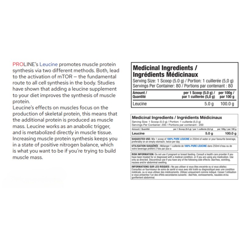 - Pro Line 100% Pure Leucine features 5 Grams of Instantized Vegan Leucine per serving, an ideal dosage to see the full benefits that leucine has to offer