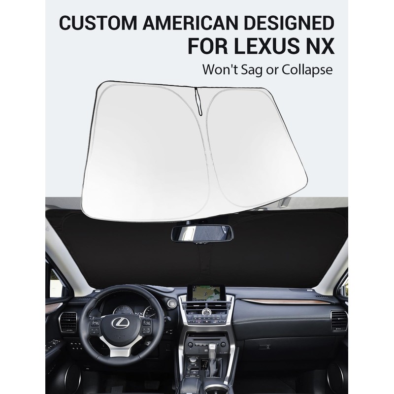 - DESIGNED IN USA!!! Custom Design: The front windshield shade has been custom cut specifically for Lexus. Precise fit design and Reinforced steel rings make a precise and secure fit to the window, no need to use suction cups to hold it in place. It won't sag or collapse like other car heat shields. Fits for Lexus NX 2021 2020 2019 2018 2017 2016 2015