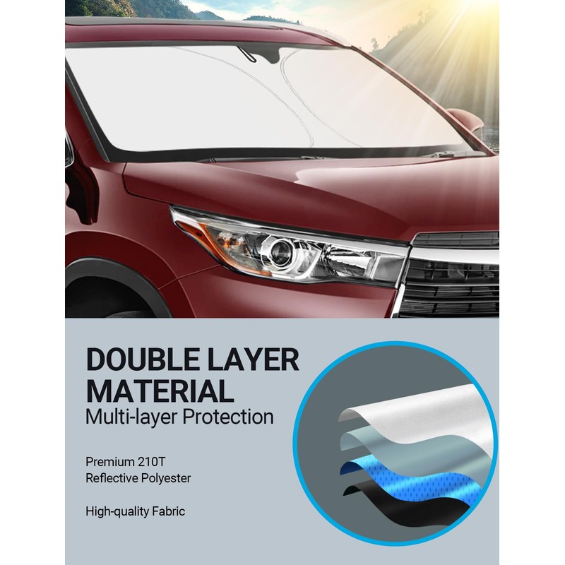 - Double Layer Sunshade: The windshield cab shade for Highlander boasts a double layer of heat shield fabric to keep out the sun. The first layer is premium 210T reflective polyester, while the second layer is high-quality fabric. Double insulation and protection, making it the best shade and insulation on the market.