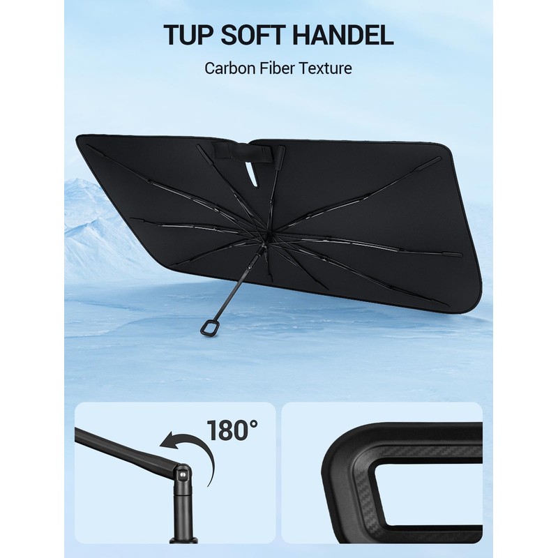 - Innovative TPU Handle Design: Unlike traditional sunshades, it adopts an umbrella like design that opens and closes very quickly. The handle of the sunshade can be bent, providing you with more flexible adjustment space. The umbrella handle is made of TPU soft material, which will not scratch the screen of your car.
