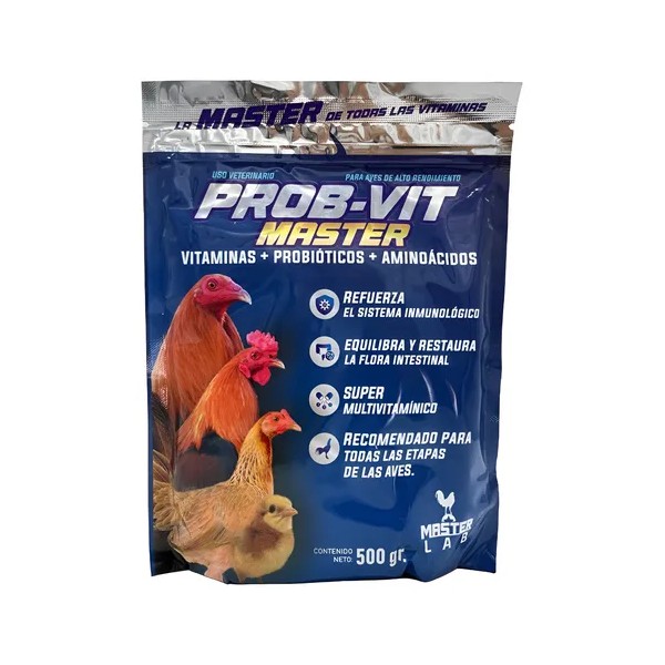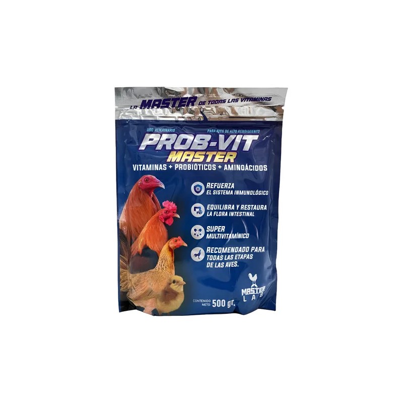 Prob-Vit Master de MASTER LAB es un suplemento premium en polvo diseñado para aves como gallos, gallinas y pollos. Su fórmula avanzada combina vitaminas, probióticos y aminoácidos esenciales que restauran la flora intestinal, fortalecen el sistema inmunológico y mejoran la vitalidad general de tus aves. Contribuye al desarrollo saludable, al rendimiento óptimo y a una digestión equilibrada, convirtiéndose en un aliado indispensable para el cuidado diario en granjas o criaderos. Presentación de 500 g, fácil de administrar y altamente eficaz.
