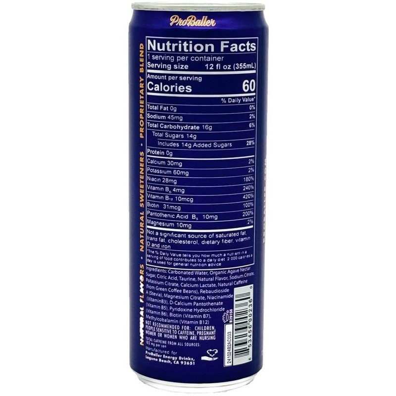 ProBaller Ultra Premium Energy Drink - Lakers Edition -NSF SPORT CERTIFED - Natural Energy Drink with Electrolytes, Organic Agave Natural Green Bean Caffeine, Biotin, Calcium, Potassium, Essential B-Vitamins with B12 (methylcobalamin), 12 fl oz (pack of 15)