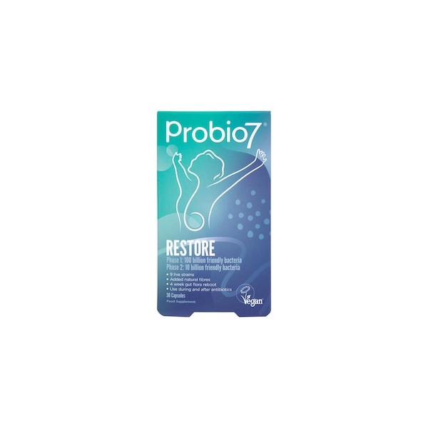 Probio7 Restore is formulated to help re-establish the good bacteria in your gut. Probio7 Restore contains Probio7 Ultra (100 billion bacteria per capsule) which encourages the colonisation of friendly bacteria and Probio7 Advanced (10 billion bacteria per capsule) which helps maintain this beneficial flora.