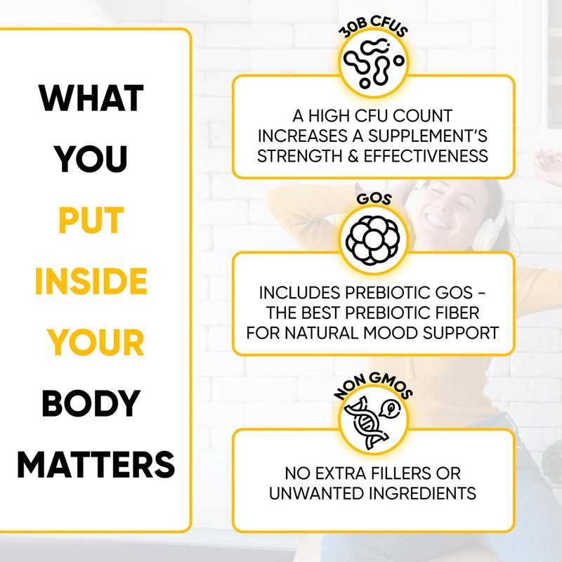 - ANXIETY AND MOOD ISSUES are not all in your head. But they could be in your gut. 30 BILLION CFU with the BEST strains for MOOD and DIGESTION make it a HIGH POTENCY probiotic... offering digestive, immune, and mental support. 60 Capsules per bottle -- a TWO MONTH supply!
