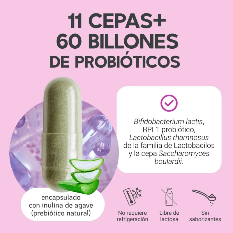- Potente Fórmula de Probióticos: Cada cápsula contiene 60 billones de probióticos y 11 cepas diferentes, asegurando un amplio espectro de beneficios para la salud intestinal.