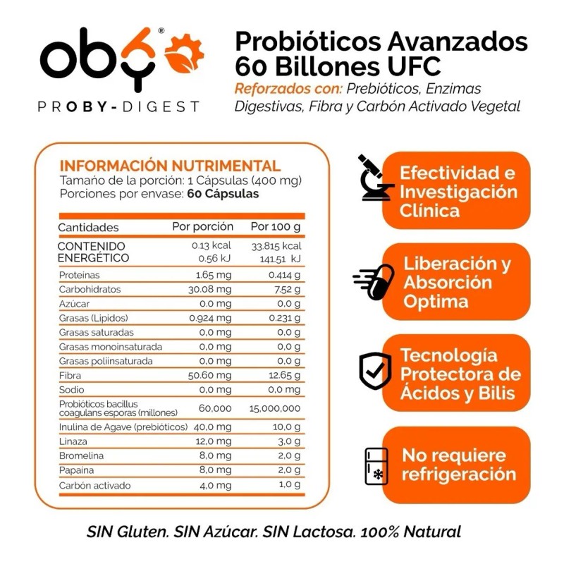 Probioticos 60 billones con Prebioticos, Enzimas Digestivas, Inulina Agave, Fibra, Carbón Activado | Vitaminas Oby 60 capsulas