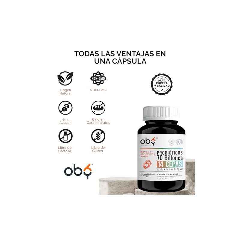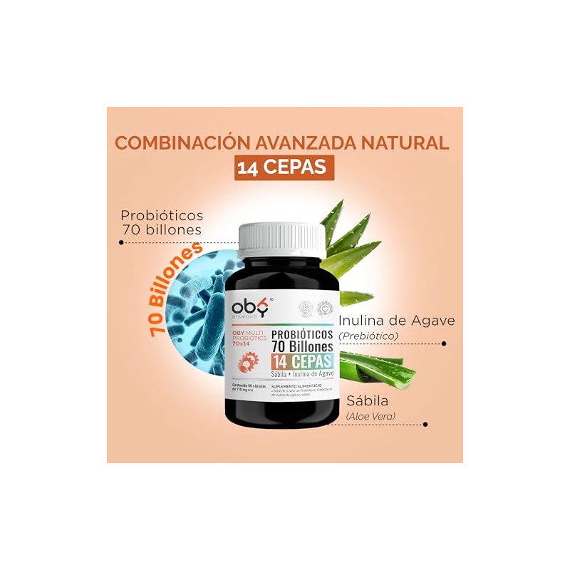 Probioticos 70 Billones de 14 Cepas + Prebioticos Inulina de Agave + Sabila | Probioticos Mujer y Hombre | OBY MULTI Probiotics 70 billones (60 capsulas)