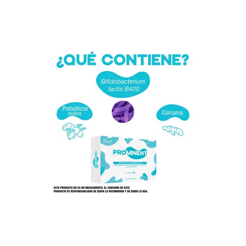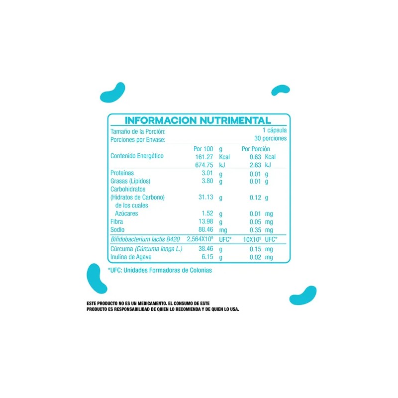 Suplemento Alimenticio con probiótico Bifidobacterium lactis B420) + Cúrcuma + Prebióticos.
