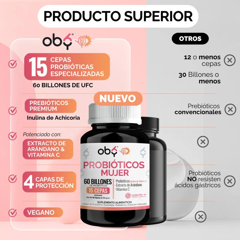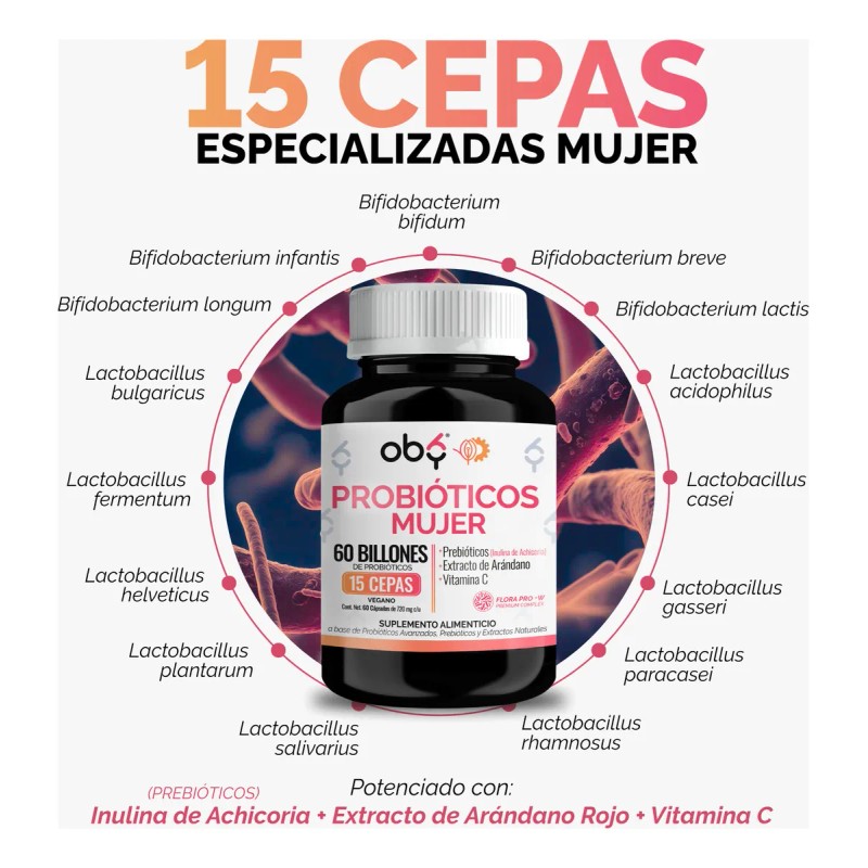 Probioticos Mujer 60 Billion 15 Cepas  Prebiticos  Arndano  Inulina Achicoria  Oby Probioticos Vaginales, Intestinal, Urinario  Probioticos Femeninos