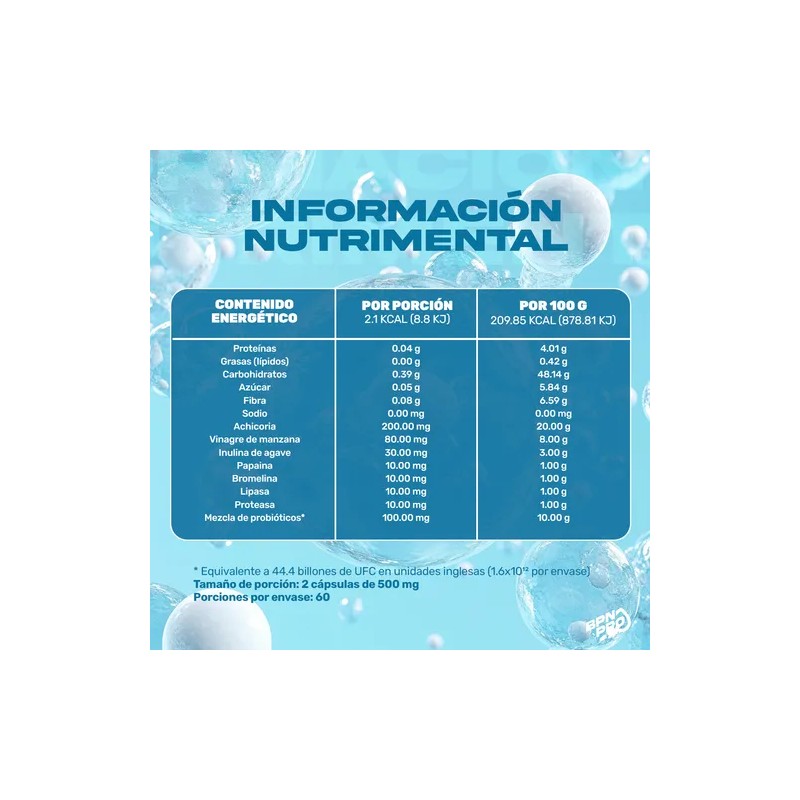 - Incluye prebióticos funcionales como inulina, achicoria y agave, que alimentan las bacterias buenas.