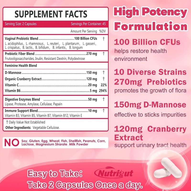 Nutrigut Women's Probiotics supplement is specially designed with 10 selected strains, 100 Billion CFUs, and enhanced with D-Mannose, Cranberry, Vitamin C, and Vitamin B6 to support digestive, vaginal and urinary health.