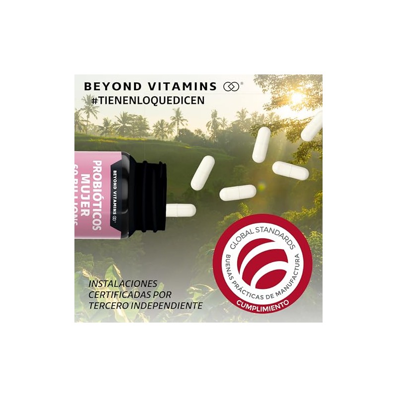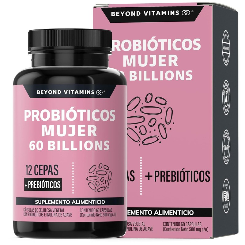 BEYOND VITAMINS - Probióticos Mujer 60 Billion + Prebióticos + Inulina de Agave| 12 Cepas con tecnología de Microencapsulación para resistir ácidos estomacales | Fórmula completa | Sin Azúcar - Suplemento Alimenticio Beyond Vitamins - Ingredientes NON GMO (60 Cápsulas)