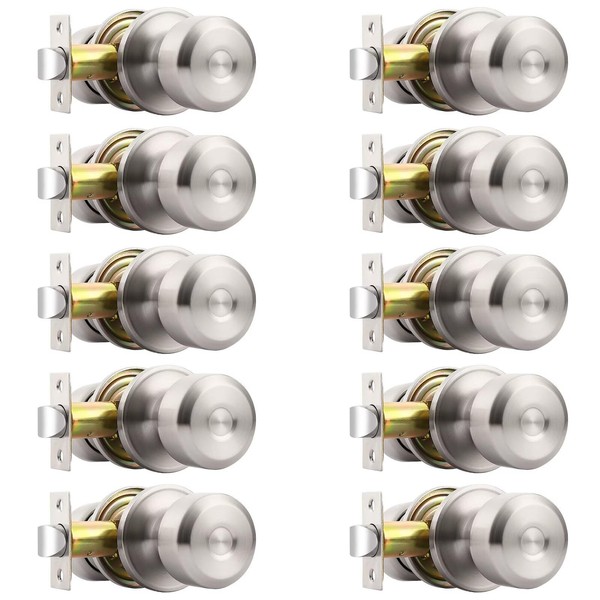 Probrico 10 Pack Keyless Door Knobs Packs, Brushed Nickel Passage Door Locks, Hallway/Closet Hardware, Universal Lock with Adjustable Latch