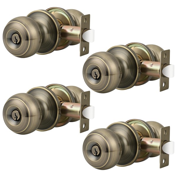 Probrico 4 Pack Entrance Door Knobs Exterior Door Lock with 3 Keys Keyed Alike Antique Brass Same Key Round Ball Entry Door Knobs