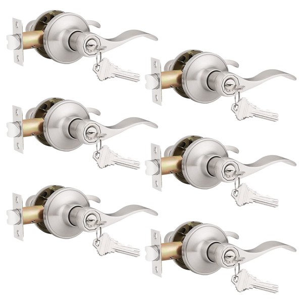 Probrico (6 Pack Keyed Alike Entry Door Lever [Lock with 3 Combo Keys],Locking Door Handle for Office or Front Door,Satin Nickel Finish Wave Entrance Door Lock, Reversible Right & Left Side Handed