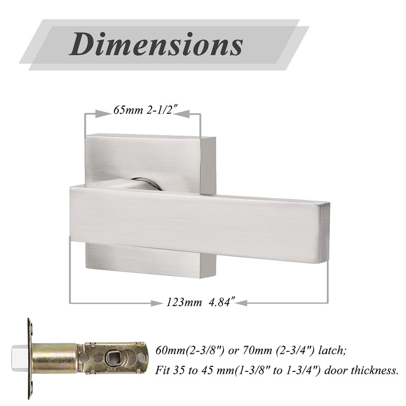 - 【Size and Dimensions】 The heavy-duty door handles and stainless-steel grab lever bring modern feel to your home. The measurements are as follows: square panel diameter: 65mm (2-3/5-inch), rectangle lever length: 123mm (5-inch)