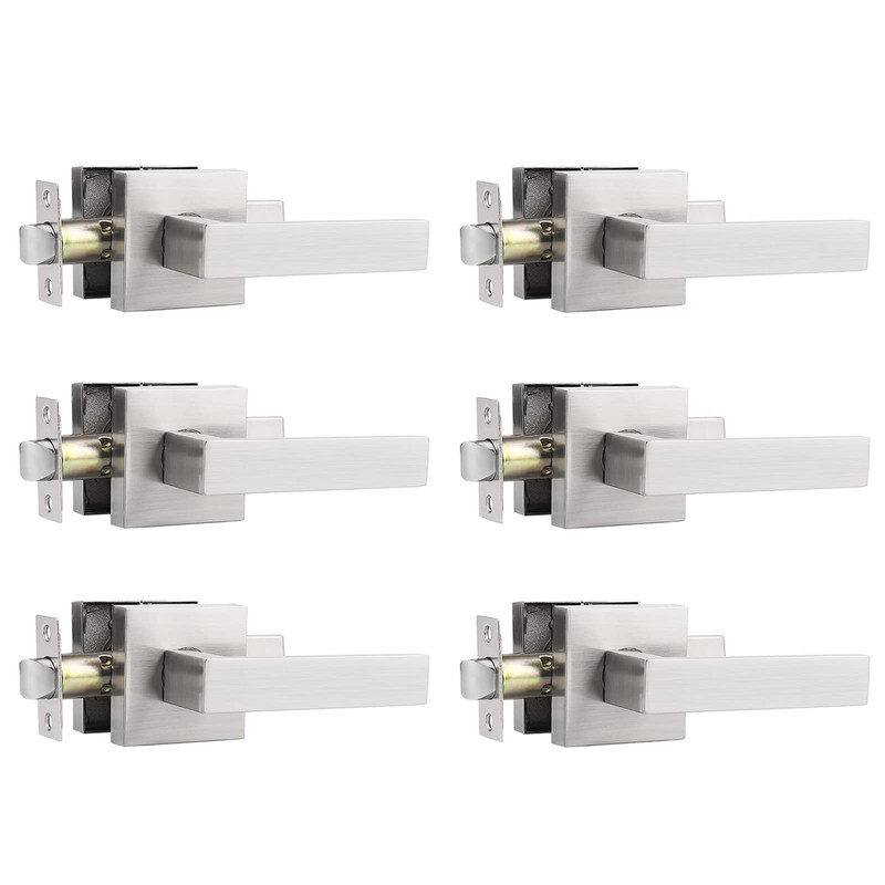 Probrico 6 Pack Passage Door Levers for Hall and Closet,Satin Nickel Finish Square Door Handles Interior Non-Locking Hardware, Keyless Feature Leversets,Heavy Duty