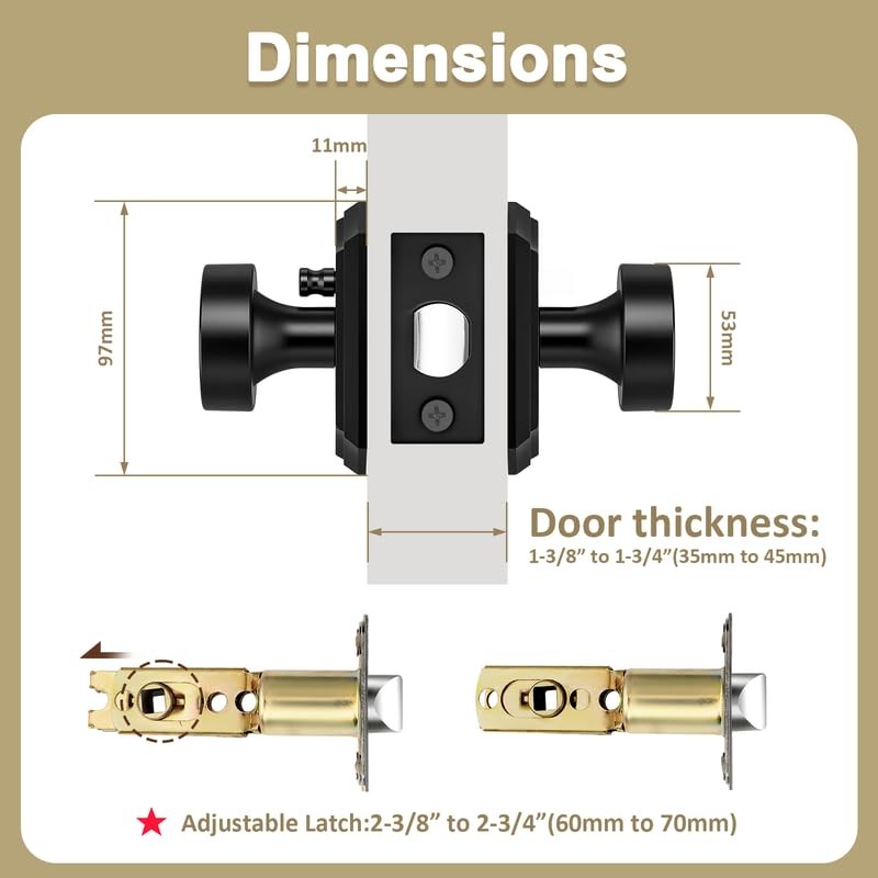 - Universal Fit & Easy Install:Adjustable latch with 60mm or 70mm backset, Fits 35mm-45mm thickness doors, 57mm knob diameter ensures comfortable grip.