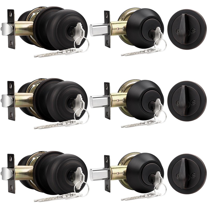 Probrico Entry Door Knob Lock Set and Single Cylinder Deadbolt Combination Set, Oil-Rubbed Bronze (3 Pack) Keyed Alike