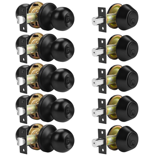 Probrico Keyed Alike Entry Door Knobs with Single Cylinder Deadbolt Combination, Flat Black, 5 Pack