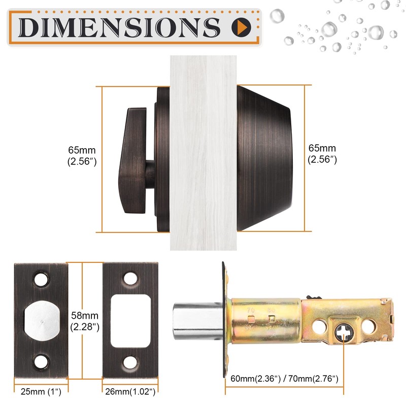 - Adjustable Latch: 2-3/8" or 2-3/4"(60mm or 70mm). Fits door board thickness: 1-3/8" to 1-3/4"(35mm-45mm). Deadbolt diameter 65mm
