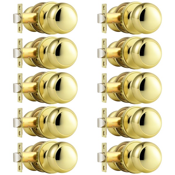 Probrico Passage Door Knobs Polished Brass Interior Hall/Closet Door Handles Keyless Locksets, 10 Pack